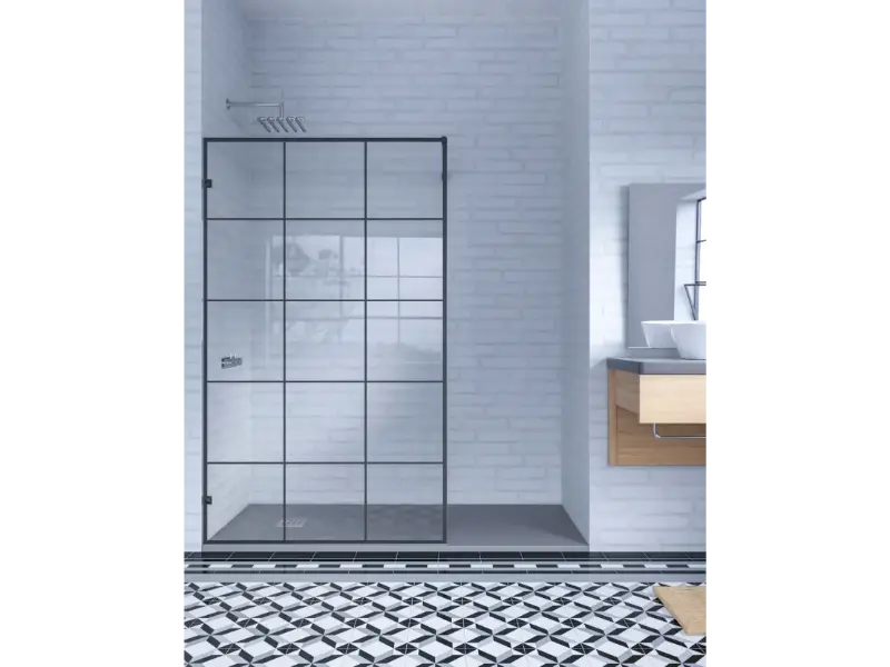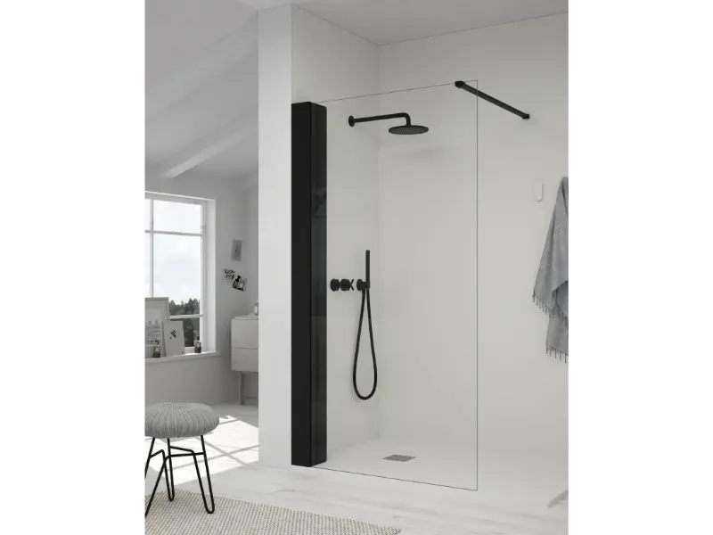 Este é um painel de vidro que está permanentemente ligado ao chuveiro. Este tipo de painel permite dispensar uma porta de chuveiro tradicional, pois funciona como um escudo e evita que a água se esgote do chuveiro